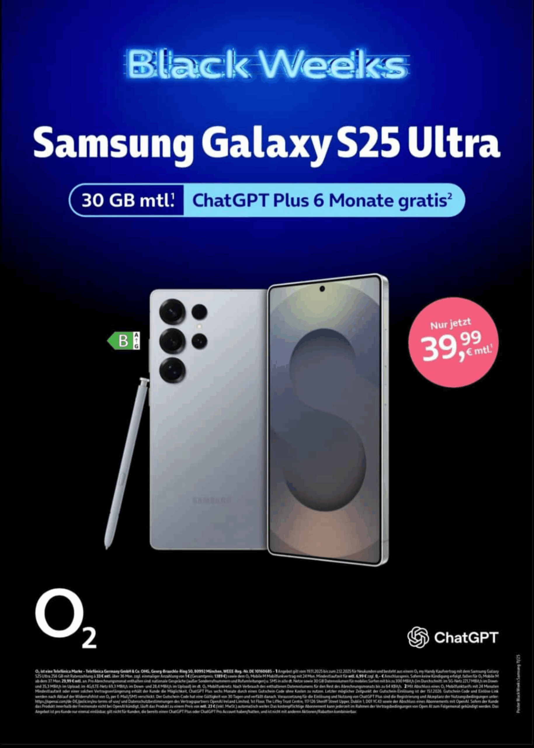 Samsung Galaxy S25 Ultra + 30 GB + ChatGPT 6 Monate gratis – alles für nur 39,99 €/Monat!
