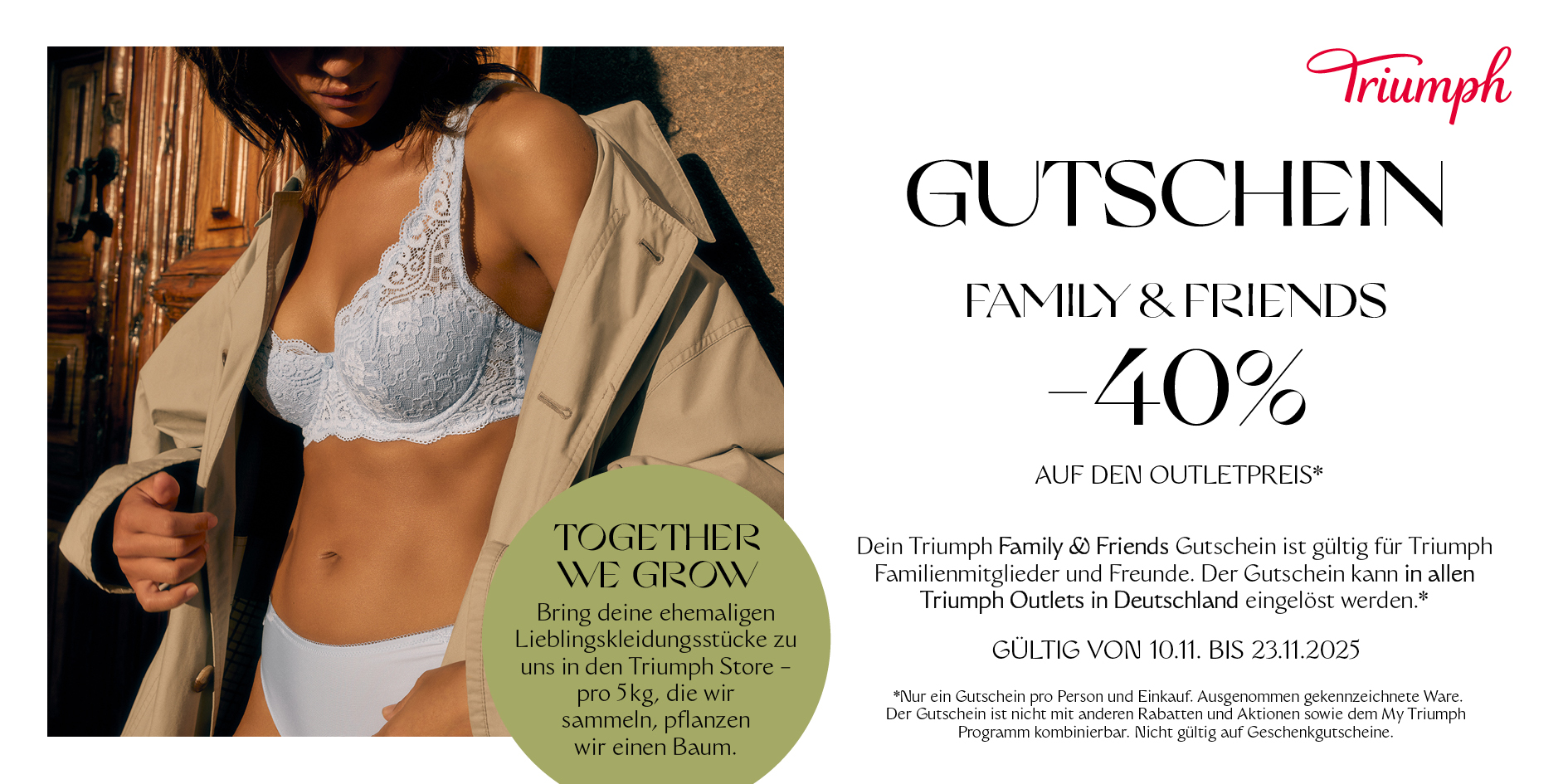 Bei Triumph gibt es vom 10.11.-23.11.25 die Family & Friends Aktion (-40% auf den outletpreis).