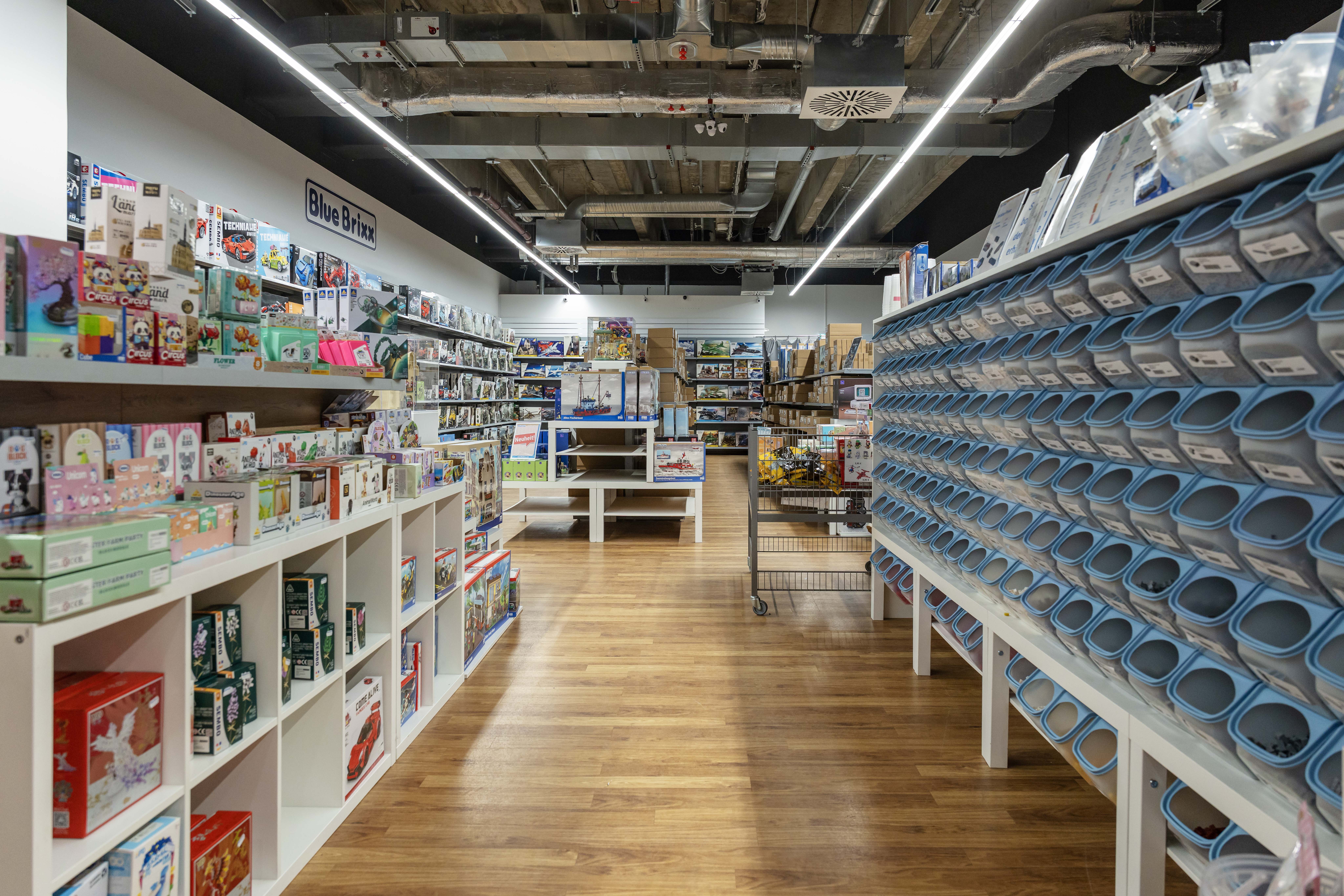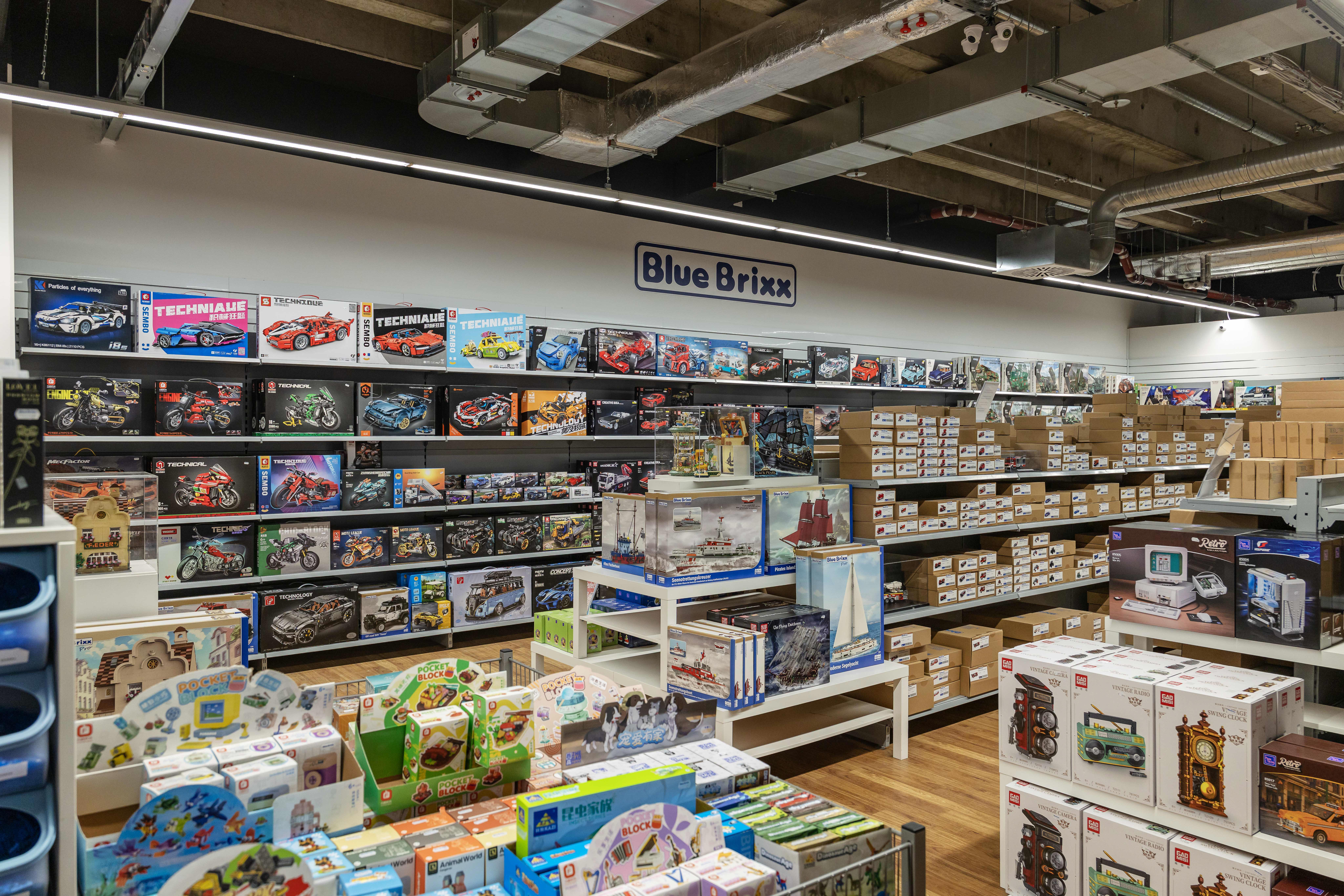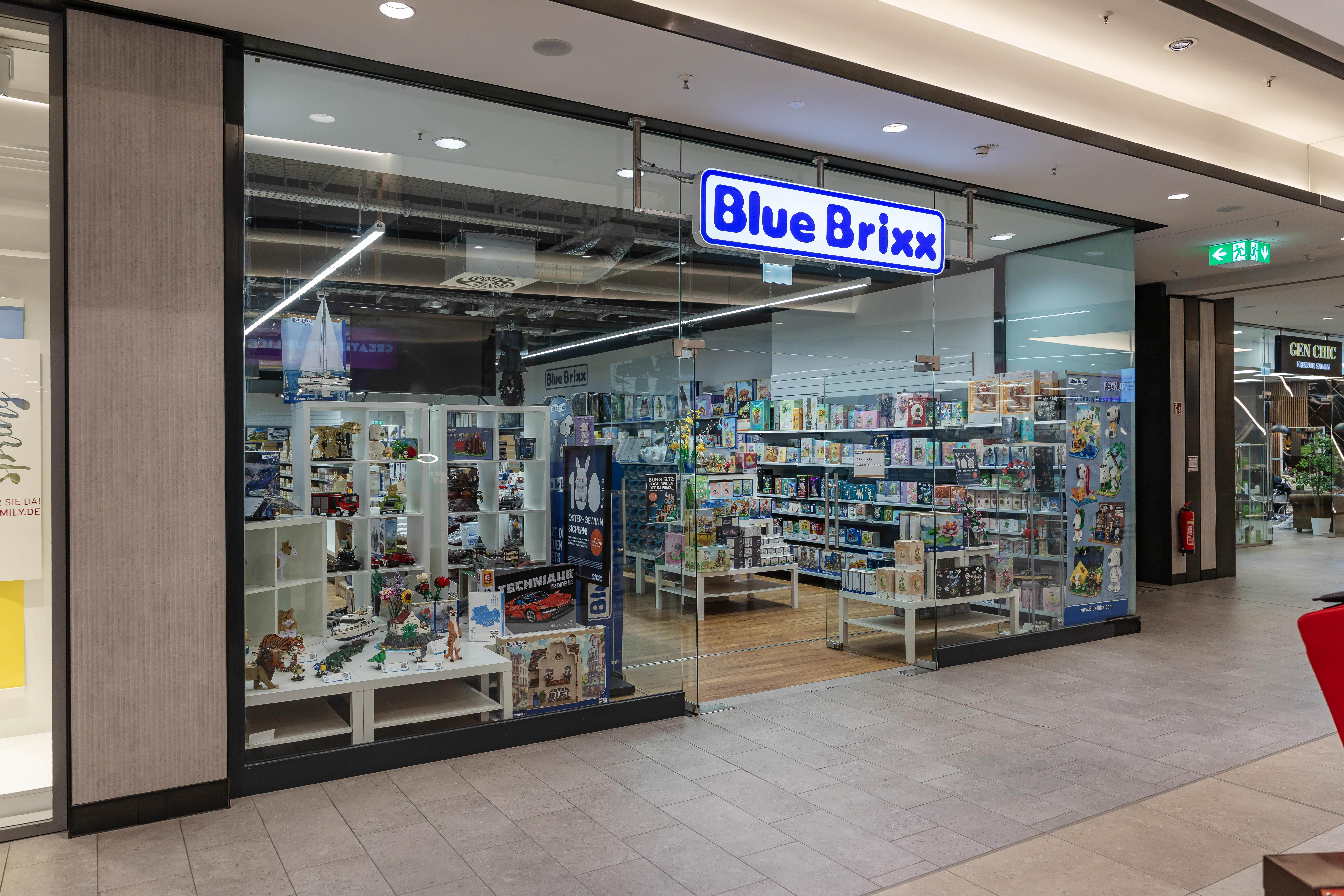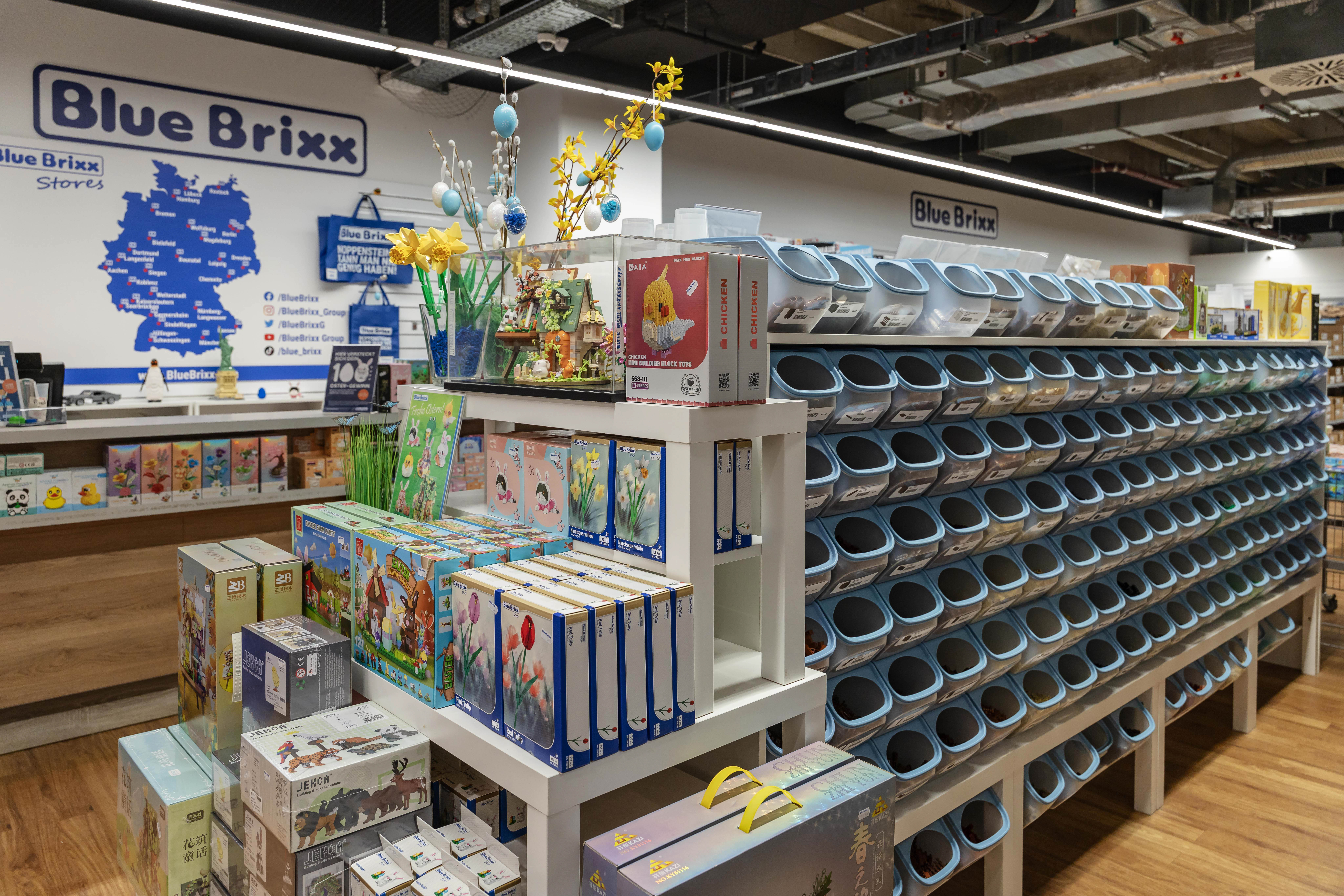 Sei gespannt auf Regale voll mit Noppensteinen von BlueBrixx. Ihr findet BlueBrixx im Untergeschoss, neben Ernsting’s Family.